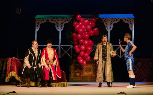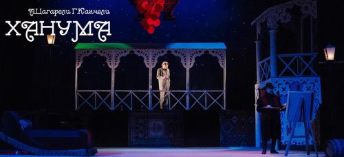 Прежде всего, мне хотелось избежать хрестоматийности. При этом не нарушая, не обкрадывая ожидания зрителя, а сохраняя весь тот грузинский колорит, что так мы любим. Он знаком и близок большинству сидящих в зале людей. Поэтому спектакль вобрал в себя все доброе, что связывало в прежние годы Россию и Грузию. Он получился нетрадиционным, неархаичным, а во многих сценах неожиданным. Например, в тот момент, когда князь играет в футбол в саду, мы слышим трансляцию игры с участием тбилисского «Динамо» и комментарии Котэ Махарадзе. Или сцена, в которой Сона появляется под звучание песни в исполнении популярного грузинского коллектива «Алило», а вместо фаэтона по сюжету она приезжает в «копейке». Ханума «терроризирует» князя песнями ансамбля «Орэра». И таких реминисценций из советского времени в спектакле много. А еще в спектакле есть Георгий Товстоногов. Он становится свидетелем разных постановок «Ханумы». Георгий Александрович появляется сначала в старом Тифлисе времени персонажей комедии: прогуливается по улочкам родного города, видит Пиросмани, пишущего свои картины, читает стихи не только Орбелиани, но и Бараташвили «Синий цвет» – одно из любимых стихотворений самого Товстоногова. Этот ход дал спектаклю некий уют с одной стороны, а с другой – снял с него пафос излишней сентиментальности.