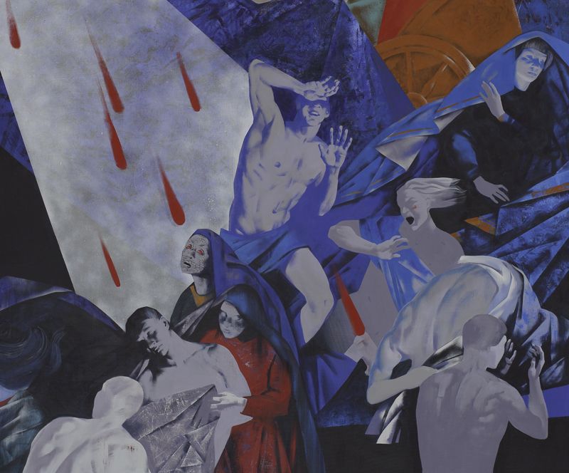 На втором семестре пятого курса перед студентами Академии стоит задача придумать тему диплома и сделать эскиз, а на выполнение отводится последний год обучения. Моя дипломная работа является росписью в театральное фойе, размер составляет 3х14,7 м. Работа над дипломом — это интереснейшее время для студента. Ему предоставляется возможность самостоятельно выбрать не только интересующую тему, но и материал, в котором предполагается исполнение эскиза. Студент получает в своё распоряжение мастерскую. Масштаб выбранной темы должен соответствовать значительности монументального полотна. Здесь не может быть случайных тем: монументальная живопись создается на века, поэтому и тема должна быть масштабной и, возможно, даже вневременной. Дипломная работа — это итог обучения в мастерской и Академии, на дипломнике лежит большая ответственность. Он должен продемонстрировать, не только то, чему он научился технически, но и постараться приоткрыть зрителю свое видение мира. А это уже больше относится к композиции. Именно композицией отличаются студенты друг от друга. Наибольшая трудность заключалась в самоорганизации и умении в короткие сроки написать полотно такого размера.