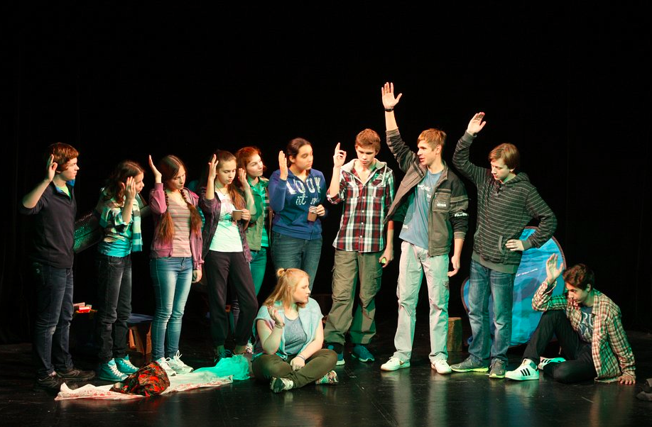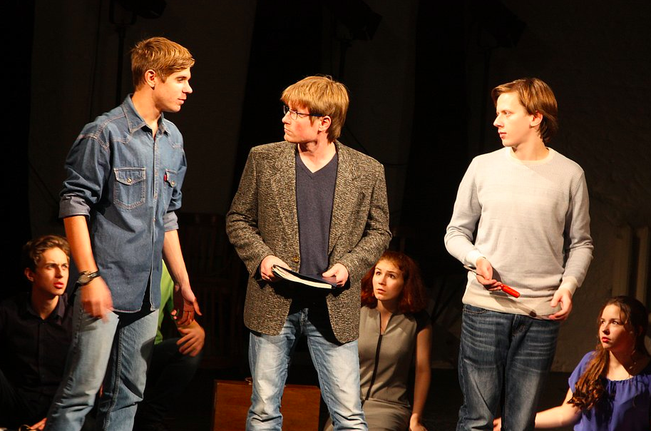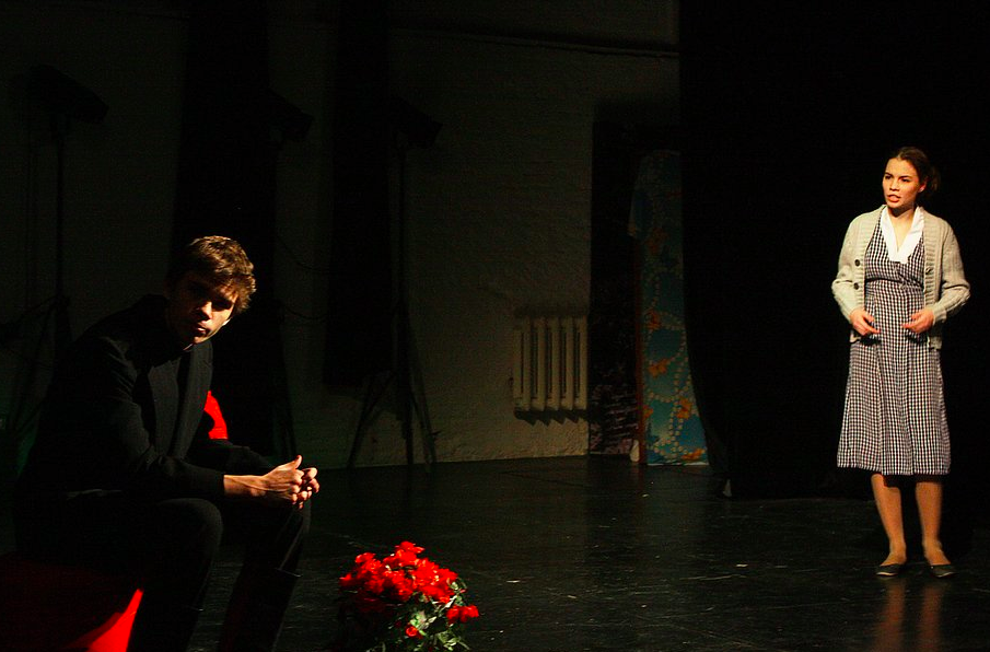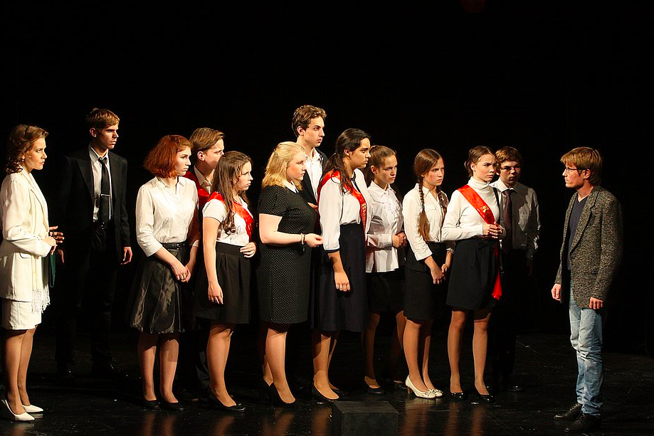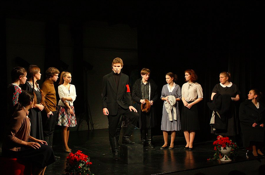 Первые минуты спектакля. На Малой сцене театра Армена Джигарханяна стоят школьники, с уст которых слетают имена знаменитых молодогвардейцев – Олег Кошевой, Сергей Тюленин, Юлия Громова и другие. Олег Кошевой читает клятву, и зрители уже уверены в том, что постановка посвящена «Молодой гвардии». Но резкое «Стоп!» из-за кулис заставляет очнуться. На сцене появляется актер Дмитрий Щепенко в роли руководителя детской театральной студии Анатолия Дмитриевича. Все сразу становится понятно – спектакль в спектакле.