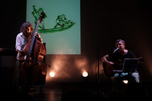 Контрабас танцует, вращается в руках Волкова, тот барабанит по нему, то щиплет струны, то использует смычок. Волны колеблют пространство, резонирует душа. Гитара звучит непрерывно, смеётся и плачет, грохочет и тонко звенит. Она создаёт путь, движет по нему вереницы слов, и все мы уносимся в путешествие далеко от этих стен, да и от земной поверхности.