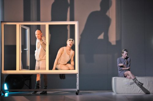 Серебренников (он и сценограф спектакля) помещает действие в почти монохромное минималистское пространство. Жизнь в обоих городках одинакова — серо-бело-черная, холодная и бесцветная. Выделяются на общем фоне и одновременно отличают два города друг от друга только установленные справа и слева яркие неоновые вывески «здесь» и «там». Стены, окно, матрас — все белое, многофункциональное и мобильное. Это и дом, это и вагон электрички, несущейся через тоннель в Ближний город, это и бордель, это и комната пыток. Две симметричные подвижные конструкции, «стены», разворачиваясь под разными углами, в нужные моменты то сужают и теснят, то расширяют, то искажают, ловко трансформируя плоскость сцены. Двигается и разворачивается все не само собой, а при помощи «статистов», безликих и безмолвных свидетелей в черных куртках, они беспристрастно, но участливо врастают в интерьеры пространств, при надобности превращаются в условную массовку, продвигая и поддерживая фоновый темп действия. Таким же образом отлажен и звуковой ряд (Екаб Ниманис), то робко, то громко и вызывающе, но всегда в такт общей теме томления и разочарованности.
