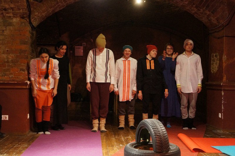 Камерная обстановка хитровских подвалов сама по себе настраивает на мистический лад, в такой атмосфере повествование о чудесах и превращениях было очень кстати, а скупость декораций и их демонстративно прикладной характер (шины от автомобиля, цепи, оранжевые столбики, огораживающие ремонтные работы на дорогах) говорили о новом, постмодернистском прочтении мифов. Начало действия тоже интриговало: безмолвная женщина таинственно кружилась по залу, актер с дефектами речи и переводчиком рассказывал присказку, а ему многозначительно поддакивал некий горбун из Нотр-Дама. Вспомнив о приглашении детей с ограниченными возможностями, зрители могли подумать, что это попытка выразить содержание сказок и на языке жестов в том числе, а не совсем типичные персонажи с разнообразными отклонениями – прием, позволяющий юным зрителям стереть границы между «полноценными» и «неполноценными» действующими лицами. Если уж даже на сцене им есть место, значит, они ни в чем не уступают здоровым людям, и не стоит пялиться на них с видом брезгливости или любопытства.