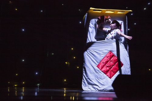 Работа с залом в этом спектакле ведется беспрестанно. Невозможно угадать, откуда выпрыгнут гномики, а кого из маленьких зрителей выведут на сцену, чтобы подружиться. На самой сцене тоже нескучно: рядом с цветным кубиком Рубика под ярким красочным зонтом расположены надувные кровати и подарки, за которыми вырастает надувная же елка.