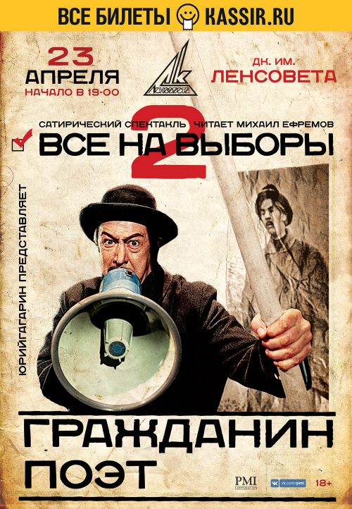 20 и 21 апреля в Москве в концертом зале «Мир» и 23 апреля в петербургском ДК Ленсовета Михаил Ефремов исполнит концерт «Гражданин Поэт: Все на выборы 2«.