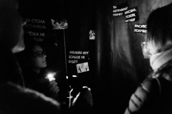 Помимо экспозиции в темноте на ART.WHO.DARK состоялась премьера интерактивного перформанса актеров “Мастерской Брусникина” – Алисы Кретовой, Марины Васильевой и Анастасии Великородной. Несмотря на то, что вовлеченность в перформативный акт была добровольной, грань между теми, кто остался в роли зрителя, и теми, кто принимал участие, растворилась в темноте – было ощущение, что все происходящее вокруг и есть непрерывный перформанс.