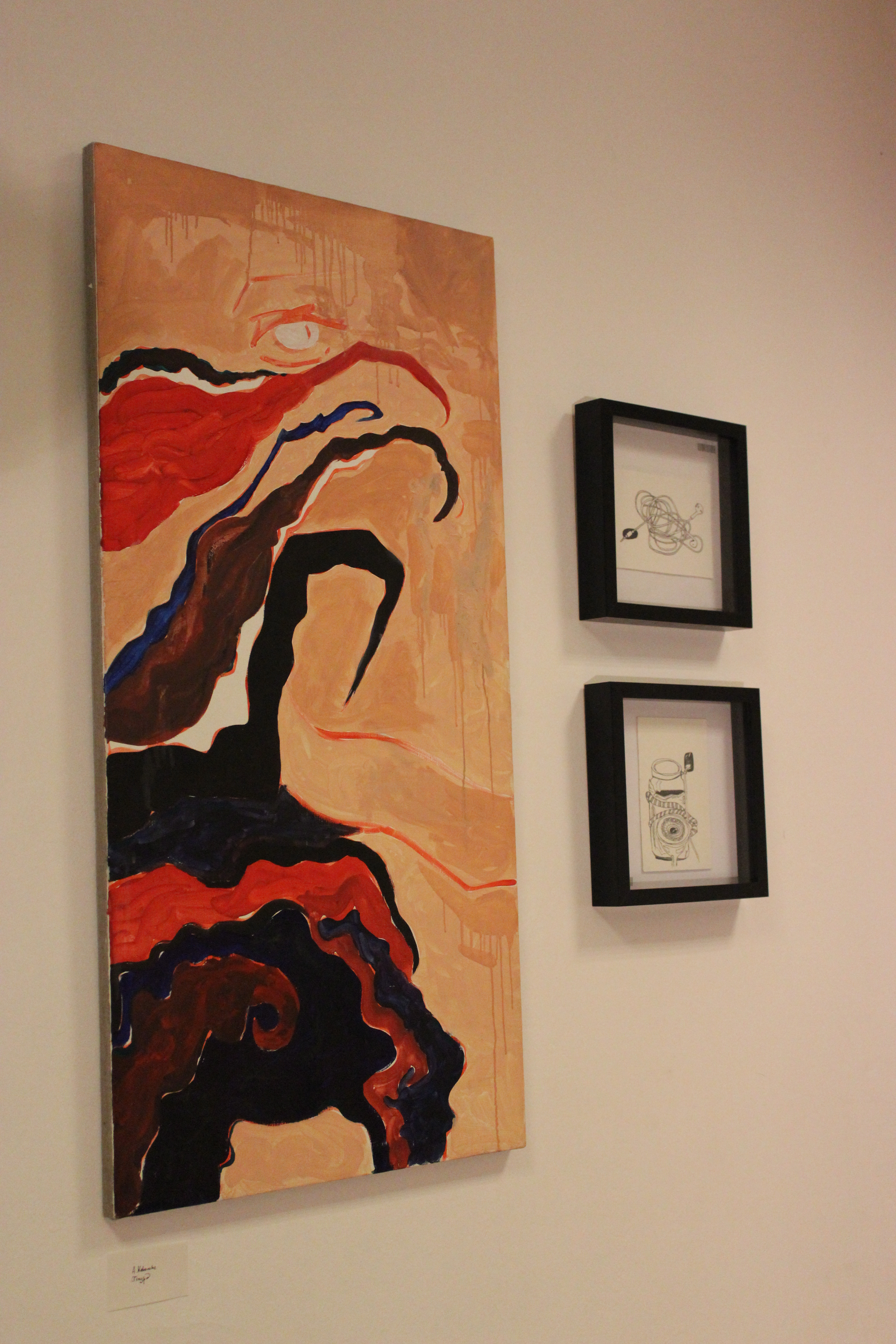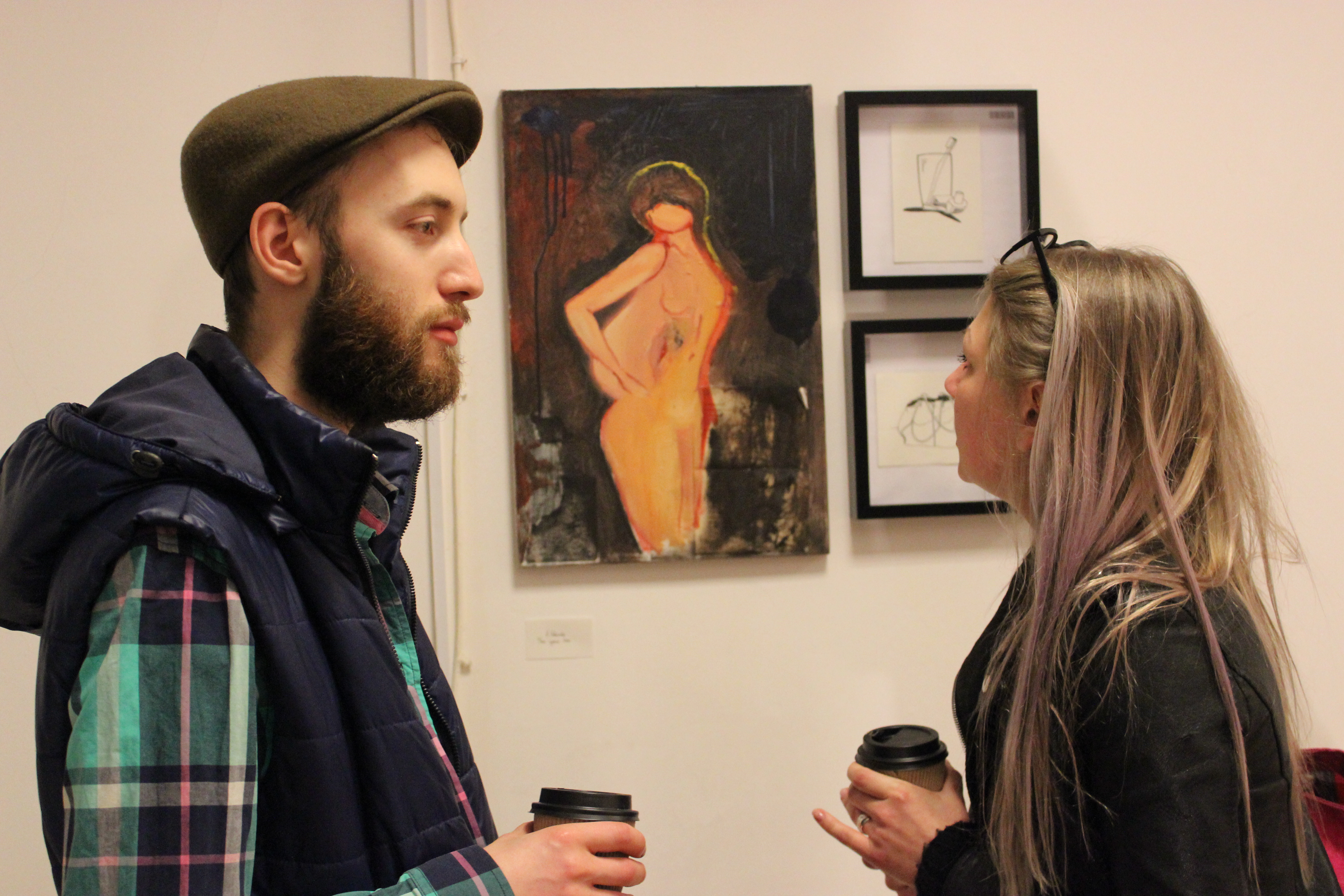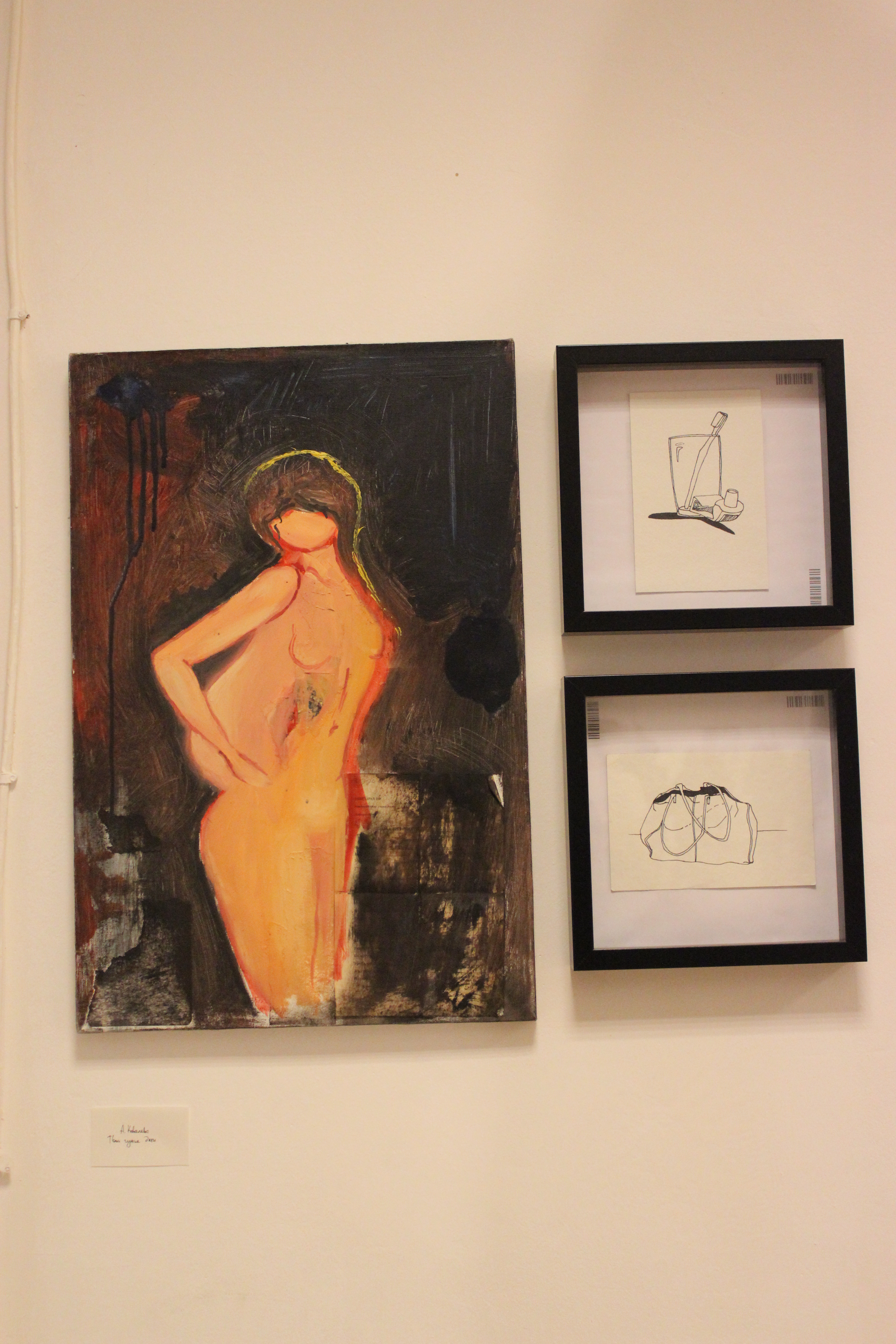 Картин немного. Они занимают только две стены. У Евгении хватает 15 минут, чтобы рассказать о том, какое значение имеет каждая ее работа. Пока часть посетителей выставки слушают художницу, другие уже угощаются алкоголем в честь открытия. Кроме двух бутылок вина посетителям более ничего предложно не было.