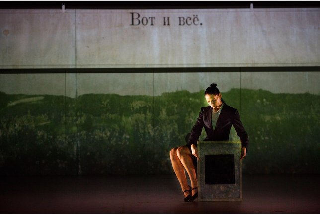 Работа с текстом для Диденко часто становится решающим фактором, ключом к пониманию – как ни странно, но режиссер, известный в театральной среде как создатель пластических спектаклей, довольно плодотворно занимается реструктурированием и переработкой литературных источников для своих постановок (здесь можно вспомнить «Флейту-позвоночник» в театре им. Ленсовета или «Конармию» в ЦИМе). Однако, в случае с Рубинштейном, все эти навыки оказались режиссеру совершенно не нужны: весь «массив» минималистичного содержания карточек Диденко целиком перенес на сцену.