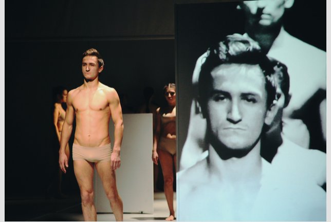 А спектакль, конечно, анализирует природу человека под давлением диктатуры. Первое, что подвергается пристальному осмотру, это тело человека: в обстановке сценического супрематизма два десятка актеров в бежевом белье медленно проходят путь по выскобленному подиуму, демонстрируя индивидуальные черты своих тел, каждую мышцу и изгиб – с детальным транслированием этих черт на экраны. Дальше они наденут на себя унифицированные тюремные (или рабочие?) одежды и выстроятся в общий марш. Но память то об индивидуализме, о торжестве личности жива?