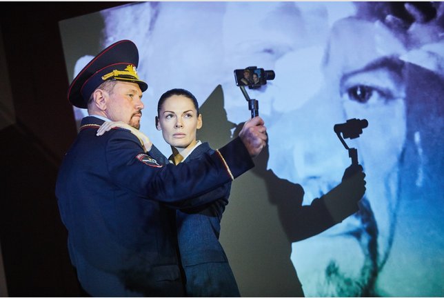 Мерно стучащая сапогами масса, которую собрали из таких разных людей и одели в спецовки, помещается в пространстве спектакля под жесткий и непрекращающийся контроль: все замедленные унылые танцы, все игры, которые затевают эти молчаливые люди, постоянно фиксируются камерами в руках представителей власти и другими, скрытыми более надежно. А над всем этим плавно покачивается из стороны в сторону «вечное зло» мира спектаклей Диденко – портрет Сталина.