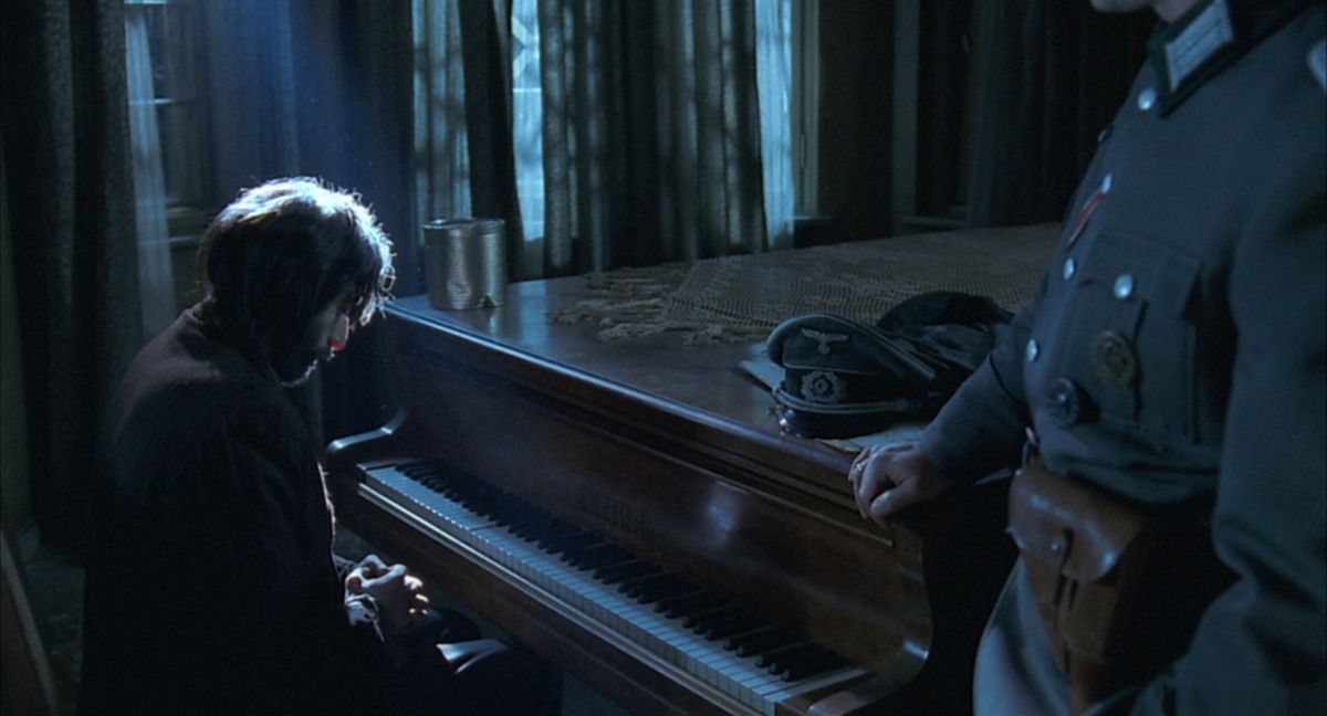 Ну и наконец хочется отметить музыкальную составляющую фильма. В фильме нет какой-либо заглавной темы, но это на самом деле и не требуется. Вся музыка, которая есть в данной кинокартине по большей части создается самим Владиславом Шпильманом. Его игра на пианино завораживает и на какое-то мгновение заставляет забыть о всех ужасах, которые происходили вокруг него. Пара минут прекрасного и умиротворяющего. И даже когда рядом стоит пианино, за которым нельзя играть, Шпильман творит музыку у себя в голове лишь постукивая пальцами в воздухе. Сцена, когда Владислав играет на пианино немецкому офицеру выше всяких похвал. Два человека, которые должны по существу ненавидеть друг друга, обретают покой под звуки нот, разносящихся по руинам бывшего города. И музыка пробуждает человека как и в, теряющем человеческий облик Шпильмане, так и в офицере, который, забыв о национальной вражде, прячет бедолагу на чердаке и помогает ему всем, чем может.