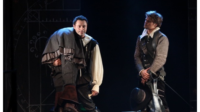Постановку Андрея Корионова украсил прекрасный актерский состав. Хорошо известному Андрею Носкову составили компанию не менее талантливые актеры Антон Гуляев, Геннадий Алимпиев, Екатерина Клеопина, Александр Глебов, Александр Ронис, Юрий Ершов. Каждому из них удалось детально показать своего героя и передать его становление. Кристиан в исполнении А. Гуляева – красавец, не умеющий связать двух слов. Полный надежд и любви в начале, постепенно съедаемый отчаянием, ревностью, растерянностью он становится ненавистен самому себе. Граф де Гиш в исполнении А. Рониса будто сошел со страниц книг А. Дюма: высокий, статный, высокомерный, заносчивый, с испепеляющим взглядом и трусливым, подлым характером. Роксана актрисы Е. Клеопиной – сумасбродная, избалованная мужским вниманием молодая девушка. Офицеры в исполнении А. Глебова и Ю. Ершова всегда веселы, оптимистичны и готовы прийти на помощь, пусть даже ценой собственной жизни. Трактирщик в исполнении Г. Алимпиева – все понимающий и умеющий хранить тайны человек. Отдельно стоит отметить актера Ю. Ершова, который за один спектакль прожил жизни не одного и не двух, а 10 героев (а его Дуэнья не оставила равнодушным ни одного зрителя, настолько комичным и запоминающимся получился персонаж!).