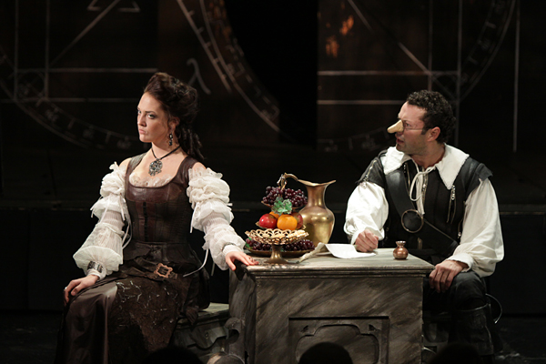 Создатели спектакля тонко и красиво показали страдания Сирано из-за своей внешности: выдающийся нос главного героя «присутствует» на лице своего хозяина не все время, а лишь в моменты уязвления и беспомощности Сирано, вызванные недостатком. В такие моменты герой А. Носкова достает из кармана накладной нос и надевает на лицо. Данный сценический ход силен с психологической точки зрения, так как лишний раз показывает, насколько современна и злободневна пьеса Эдмона Ростана: во все времена люди комплексуют из-за своей внешности, потому что всегда и везде судят по внешнему виду, встречая по одежке. Но ведь провожают по уму! Роксане не столь важна наружность, она признается Кристиану, что будь тот глуп, она бы его разлюбила, так как ей важны были внутренние качества. Но «его» письма доказали, что в молодом военном смогли ужиться красота и ум (о, как страдает от этих слов глупый красавец!).