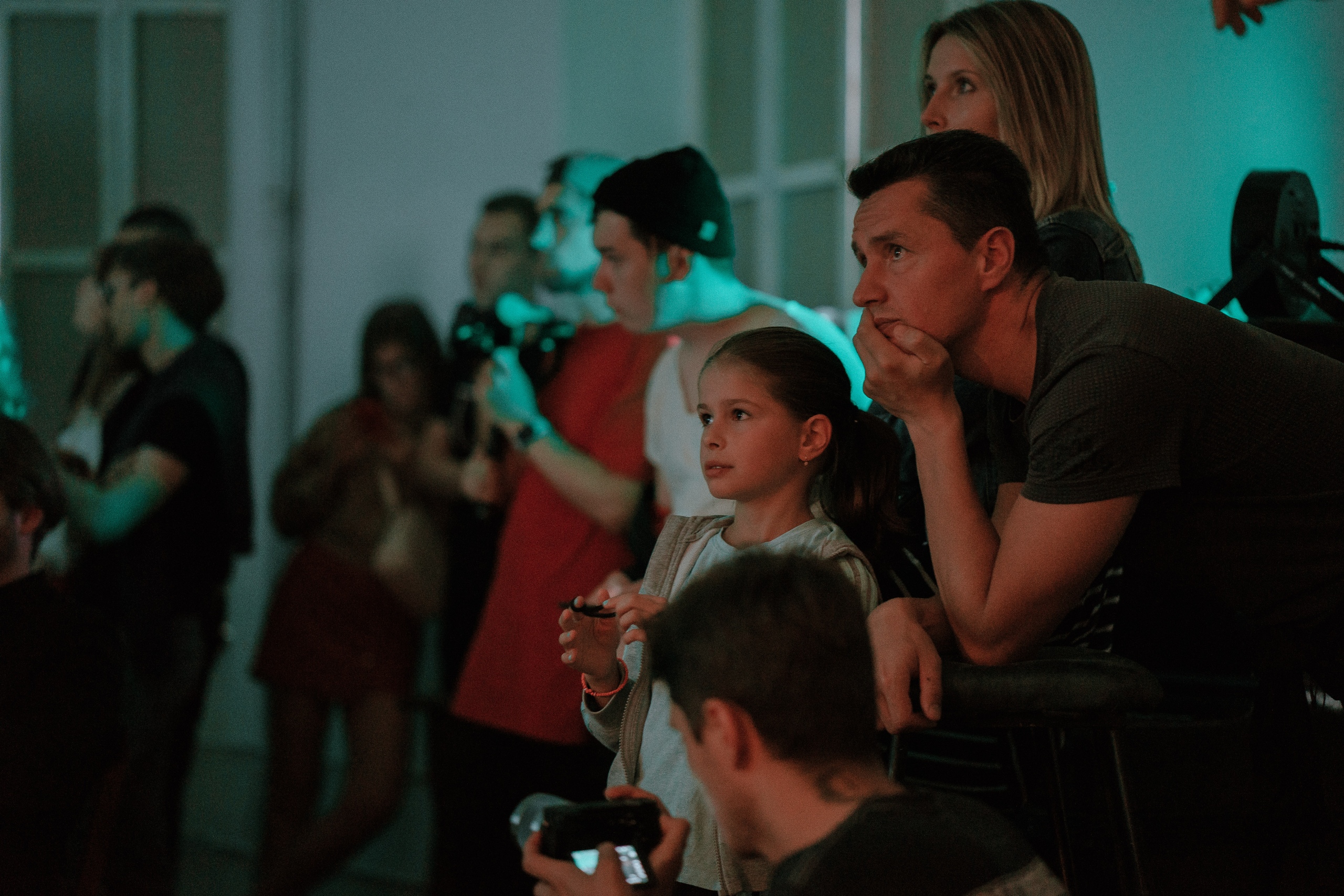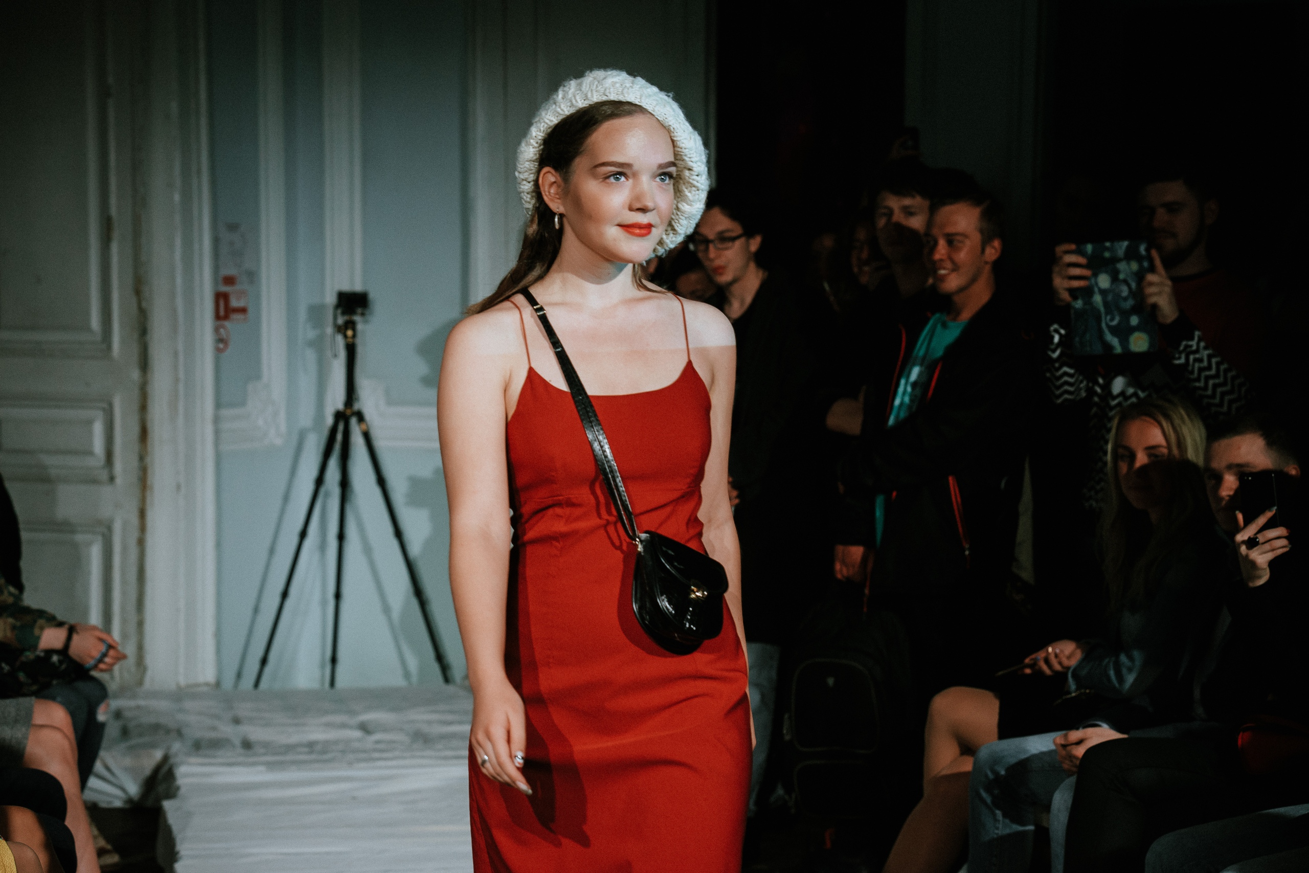 Показ занял один из залов «Голицын Холла». Для моделей был создан импровизированный подиум — доски, которые обычно используют в грузовых перевозках, уложили на пол, и накрыли белым полотном. Этот пятачок в два метра был окружен двумя рядами стульев для зрителей. По количеству стульев ясно, что организаторы не рассчитывают на большой ажиотаж. Они просчитываются. Желающих посмотреть на новое видение моды оказывается больше, им приходится стоять вокруг подиума.