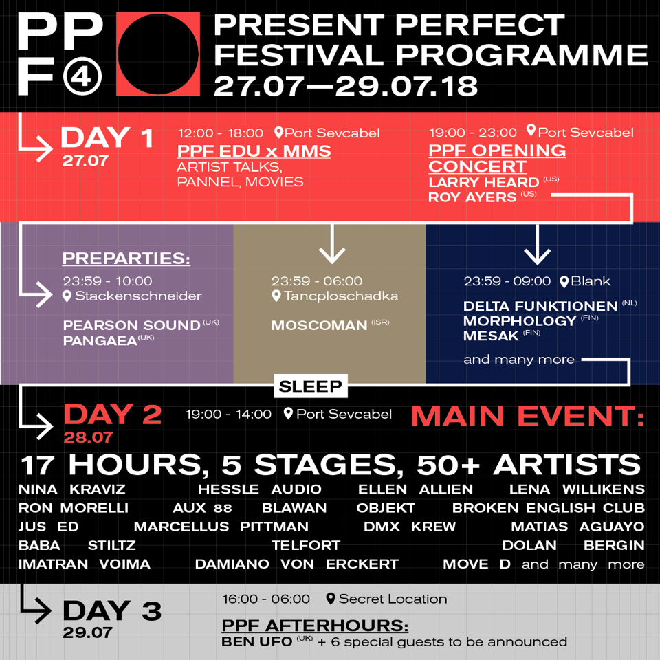 В основе художественной концепции PPF’18 лежит представление об “идеальном настоящем”, которое манифестируется самим названием фестиваля. В этом году пространство Present Perfect вдохновленно эстетикой микрогорода со своей площадью, набережной и другими важными объектами, позволяющими ему на двое суток стать независимым и ярким дополнением развивающейся инфраструктуры гавани Васильевского острова.