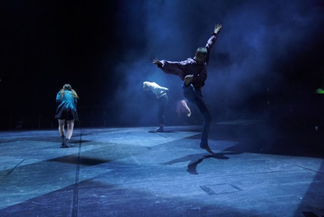 Не менее удивительным и философским оказался спектакль «внейтрино» санкт-петербургской танцевальной компании «Каннон-данс». Восемь танцоров в броуновском движении частиц задавались глубокими вопросами, раздевались, подсматривали, рисовали, любовались закатом, открывали двери в себя и в некий альтернативный мир.