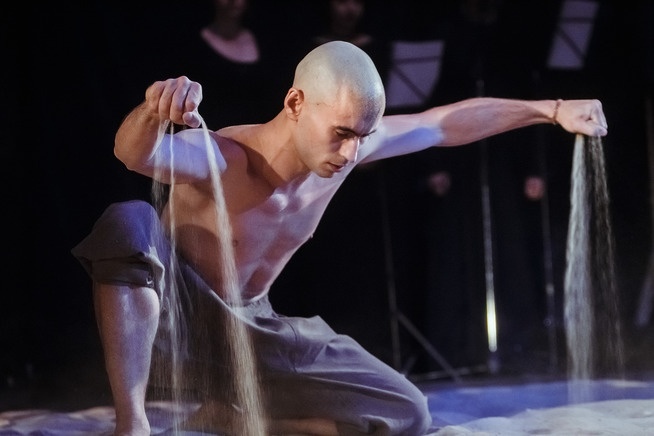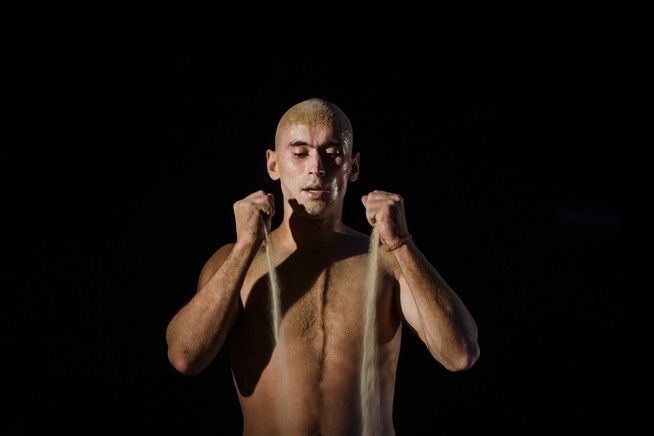 Покрывая голову песком, танцор, словно обращался к предкам, воскрешая не только утерянный алфавит, но и забытую древнюю культуру с многовековой историей. Вводящее в транс повторение и практически суфийские кружения вошли в танец, то напоминающий восточное единоборство, то некий ритуал с мольбой и безудержной радостью. Песок – символ одиночества, мощи стихии и бесконечности пустыни придал спектаклю особенное движение и создал атмосферу для наиболее глубокого восприятия внутреннего обращения героя к его корням.