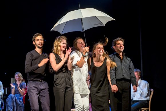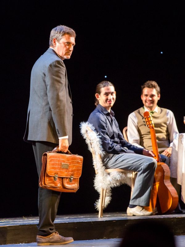 Праздник, тёплый и ностальгический, напоминал «Голубой огонёк»: артисты, расположившись за столиками на сцене, вели задушевные беседы, делились воспоминаниями о своих первых ролях (ведь многие из них в труппе – с момента основания театра, то есть уже почти 30 лет!), пели, танцевали и радовались тому, что обрели в театре свой второй дом и хороших друзей. А разлетевшиеся по другим странам актёры Театра Дождей присылали тёплые видеопоздравления.