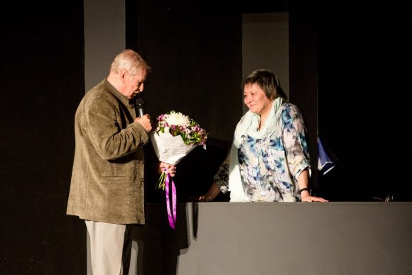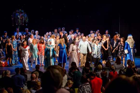 Под занавес вечера все-все-все — актёры, реквизиторы, администраторы, хореограф и концертмейстер – высыпали на сцену и, загадав заветное желание вместе со всем залом о новой, большой сцене для театра, которая сможет вместить всех желающих посмотреть спектакли, исполнили хором песню-поздравление для любимого руководителя.