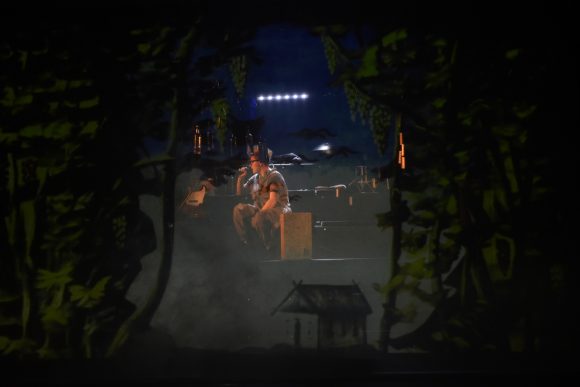 Действие начинается со звука. При пустой ещё сцене, пока собираются зрители, гудит и переливается, создаёт ритм негромкий фри-джаз. Вот наступает тишина. На сцене двое, спектакль рождается из шума «посоха дождя», из перкуссии, из стрекотания ночных южных насекомых. А дальше?