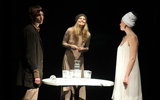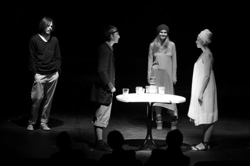 Занавес открывает темную сцену, 4 актера (Алена Бондарчук, Илья Дель, Иван Николаев, Алена Старостина) попарно или один за другим сменяют друг друга и молча смотрят в зал. Проходит 20 минут. Бытовая история немецкого студента и фабричной рабочей девушки, завершившаяся нежелательной беременностью, не происходит и не развивается. Актеры попеременно читают текст. Намеренно монотонно. Из декораций – стеклянные стаканы с прозрачной водой собираются в разные формы — столб, вращающийся круг, конвейер – идея художников Якова Каждана и Ксении Перетрухиной. О стакане воды, «означающем в марксизме безответственную свободу сексуальных отношений» после премьеры 5 лет назад рассуждала Colta. При перестановке конструкции намеренно шумно передвигаются за закрытым занавесом, будто самими актерами. Бедный и честный пролетарский театр – это от Мюллера, а когда актеры вообще никак между собой не взаимодействуют – это от Волкострелова. Сложнее тишины только многократное повторение текста, один и тот же кусок может повторяться 2, 3, 8, 16 раз…