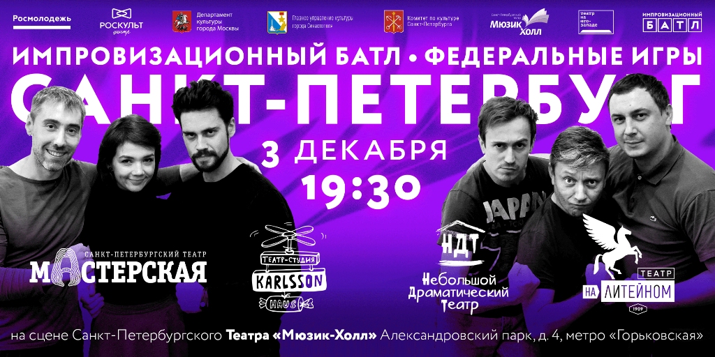Для сборной команды актеров — импровизаторов Санкт-Петербурга театральная игра продолжится в столице участием в «Импровизационном БАТЛе. Федеральные игры», который состоится 24 декабря на сцене московского музыкального театра «Геликон Опера». Вместе с питерскими артистами на столичную сцену выйдут сборные команды Москвы и Республики Крым.