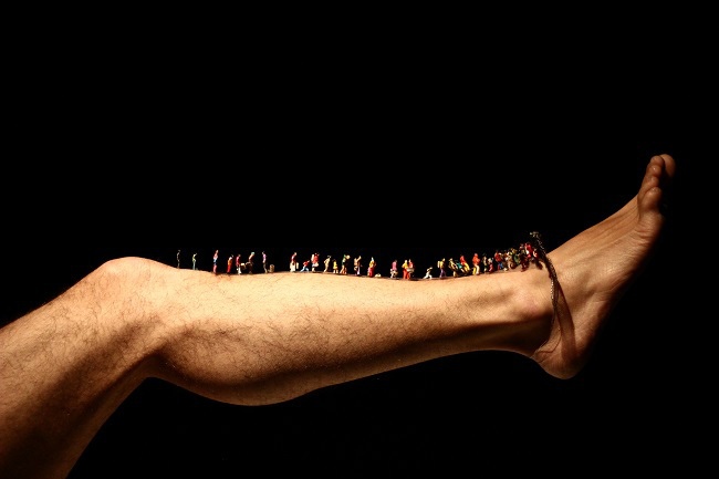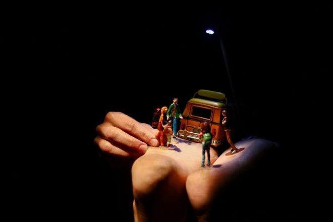 Само действие началось тогда, когда Сандрина и Исмаэль медленно расшнуровали, а затем сняли ботинки и носки. Сначала сценой, а может быть, землей или планетой стала спина Исмаэля. На ней Сандрина разместила фигурки кукол. При этом, футболка закрывала голову и глаза актера. Он, как некий бог или вселенная, стал целым миром для крошечных людей, при этом оставаясь незрячим к тому, что происходило.