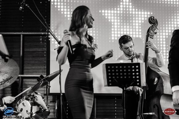 Анастасия Сазонова в серебристом сверкающем платье с открытой спиной, нежным волнующим тембром, сильным и красивым голосом и обаятельной улыбкой была настоящей звездой вечера, от которой было невозможно отвести взгляд. Несмотря на то, что классический джаз зачастую исполняют вокалистки с низкими голосами (Nina Simone, Billy Holiday), Барбара Стрейзанд и другие певицы с высокими голосами также добивались признания. Когда слушаешь вокал Анастасии, вспоминается Нора Джонс, у которой также красота голоса все же превалирует над джазовой фразировкой.