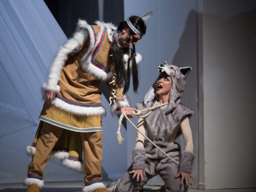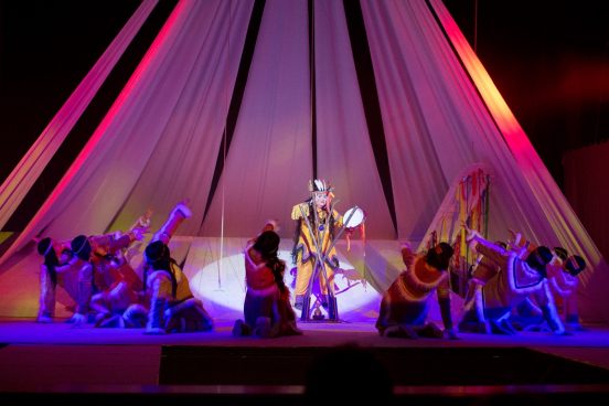 Атмосфера спектакля, то магическая и страшная, то просветлённая и трепетная, создаётся выразительной и оригинальной мелодикой, острыми ритмами, искусными стилизациями индейских песен и шаманских обрядов. И конечно, художественным решением спектакля, которое осуществил известный тувинский художник Начын Шалык. Впечатляющая сценография — лаконичная, образная и цельная — вбирает элементы этники северных народов.