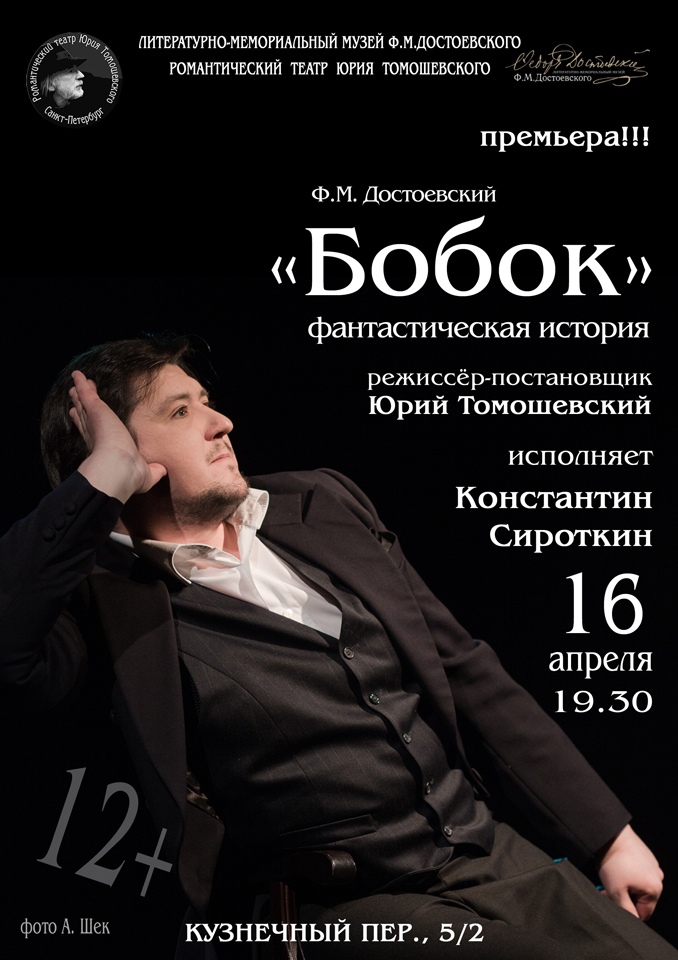 Моноспектакль Константина Сироткина «Бобок» в постановке Юрия Томошевского позволит зрителю в полной мере насладиться прелестью произведения Достоевского, филигранной режиссурой и также искрометным юмором и необыкновенным обаянием исполнителя16 апреля в Литературно-мемориальном музее Ф. М. Достоевского.