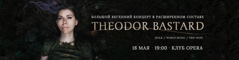 Большой весенний концерт THEODOR BASTARD в расширенном составе пройдет 18 мая в Санкт-Петербурге в клубе Opera. Группы с двадцатилетней историей. Группы, словно пришедшей из мифов и снов, и кажется, что невозможной в нашем мире.