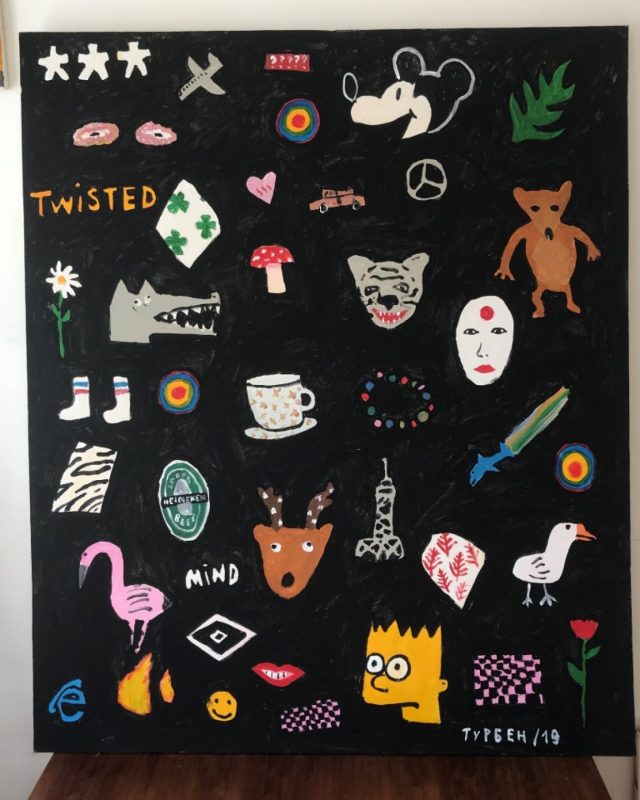Источником вдохновения для Турбена становится повседневность, наполненная многослойностью визуального кода города, лентой соцсетей, образами из клипов и кинематографа. Эти мимолетные, как будто выхваченные из потока сознания картинки, Турбен переносит на холсты, создавая живопись, чем-то напоминающую детские рисунки. Предельно упрощенное изображение и открытые цвета, узнаваемые образы, ироничный и серьезный текст — все это раскрывает личность художника, который стремится быть честным с собой и со зрителем. Для этого он сознательно избегает сложных тем и тяжелых концептуальных формулировок, сохраняя драйв и энергию уличного рисования.