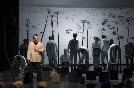 Обращают на себя внимания предметы, маркирующие так называемую «русскость». То есть если приметы времени в этом спектакле неконкретны, то пространственная принадлежность для авторов постановки явно важна. Встречается и лубочный мужик в исподнем и валенках с балалайкой в руках, и виды безмолвных, бескрайних пейзажей, столь свойственных для нашей страны, и до боли знакомые палки борщевика, увенчанные шапками сухих соцветий. Длинный пронзительный монолог героя «Чего хочешь ты от меня, о Русь?» окончательно рассеивает все сомнения. Это размышления режиссера о России, о нашей, культуре, ментальности и судьбе.