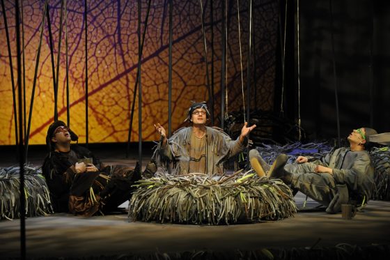 Из немногочисленного предметного мира в спектакле используются табуреты, из которых складываются, собственно, практически все необходимые декорации.
