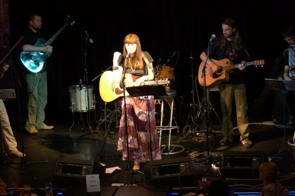 Да, есть такая песня, мы ее записали в Рождество. Сидели под елочкой, и захотелось нам спеть какую-то светлую песенку под настроение на три голоса. Я спела первый куплет, Лиза второй, Соня третий. А четвертый мы спели вместе. Дима на скорую руку придумал аккомпанемент, подыграл на гитаре. И потом на концертах несколько раз спели вместе с девочками. Лиза сильно волновалась, она у нас медик, поёт только в семейном кругу. А Соня музыкант по призванию, в прошлом году закончила музыкальную школу, часто выступает с «Белой Гвардией». Минувшей осенью ездила с нами на гастроли в Европу, играла на концерте в Париже (на белом рояле!) песню «Память о небе», посвященную Марине Цветаевой. А когда Саша Тарасов (баянист) улетел в Москву, то Соня играла на фортепиано все оставшиеся наши концерты «от и до», замещая всех музыкантов – и партию баяна, и скрипки, и флейты. В этом году она закончила девятый класс и собирается поступать в музучилище. Она просто влюблена в музыку. И в нашу авторскую, и в классическую, может часами слушать и играть.