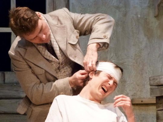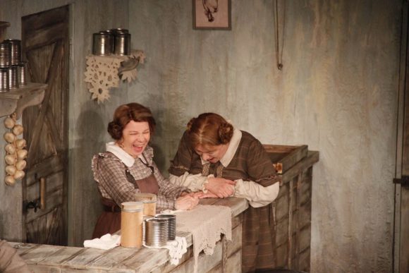 Интересна сценография спектакля – на пьедестале расположена мобильная конструкция, которая вращается и мгновенно переносит зрителей то в магазин тётушек Кейт и Эйлин, но на берег, к лодкам и шумящим волнам, то в далёкий Голливуд.