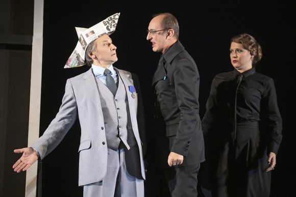 На контрасте с хаотичным, иррациональным положением вещей в доме барона представлена обитель бывшей супруги (Светлана Шаврова) и сына Феофила (Игорь Ключников). Здесь всё строго и аргументированно – правит бал адвокат и любовник Якобины Рамкомпф (Александр Безруков). Их костюмы – классические чёрные, с чёткими геометрическими линиями (в отличие от чуднОго сказочного сюртука барона и воздушного платья «а-ля Мальвина» в сочетании с синими колготками Марты), разговоры — бесстрастные и сухие, даже охота на уток представляется в виде компьютерной игры на проекторе.