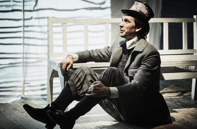 Как режиссер, Андрей Аршинников уже в этом сильно отличается от остальных, текст спектакля максимально близок к оригиналу, из декораций на сцене чемодан, лавка, стул и молоток для крокета. Актер одет в костюм, соответствующий времени повествования, а внимание зрителя приковано к белым простыням. Простыни на прищепках делят сцену пополам. Позади светит проектор и показывает на простынях картинку.