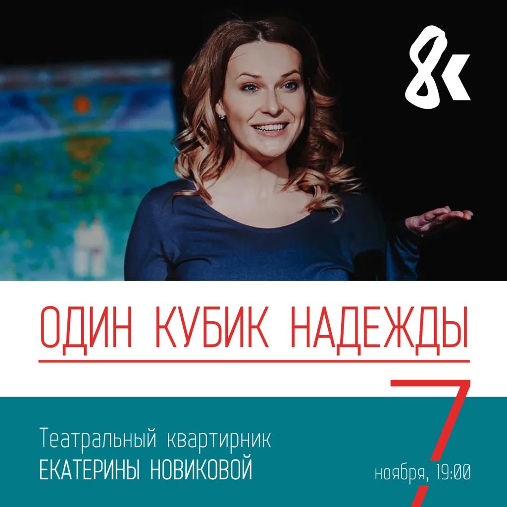 Екатерина Новикова сыграет свой моноспектакль «Один Кубик Надежды» 7 ноября в атмосферной чайной «Квартиры 8». Основа спектакля — рассказы Виктории Токаревой, а также стихи самой Екатерины, которая является резидентом поэтического проекта ЛитГост, трёхкратным победителем конкурса поэтов PoetFest.