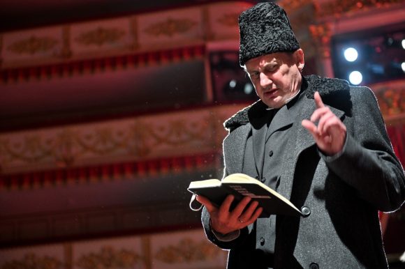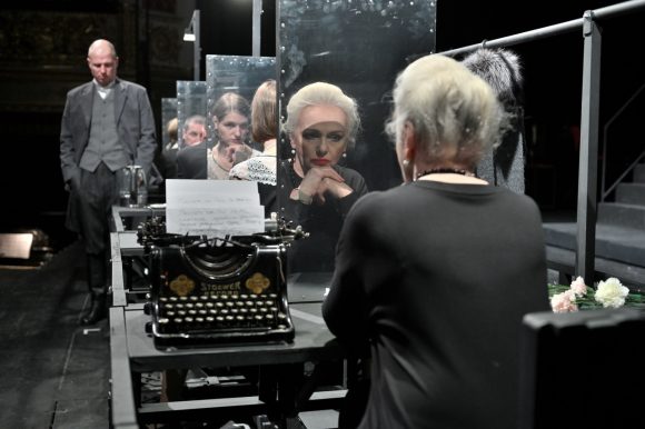 Вообще, приятно смотреть, на что способен театр, у которого есть деньги. Представьте себе, персонал во фраках провожает до места, мягкие кресла обиты бордовым бархатом, в свете люстры блестит позолота на лепнине, украшающей ложи, шею может заклинить пока до третьего звонка рассмотришь все рисунки на потолке. На сцене же гигантская кукла Маяковского застрелится на ваших глазах, подъемные механизмы делают из конструкции высотой с трехэтажный дом, то стену с мультимедийным экраном, то пол, по рельсам ездит вокруг стола начальственное кресло, с полотка спускается огромный незаконченный портрет, переодетый в женский костюм мужчина с красным кубом на голове управляет катаниями актеров на гримерных столах. Чистый зрительский восторг от минимализма, технических чудес, масштаба и эклектики.