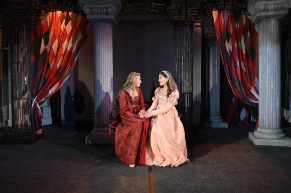 Все действие происходило на небольшой сцене Зеркального зала среди колонн и минималистических декораций. Смену образа жизни символизировали шторы: в родовом гнезде девушки — яркие с красными и чёрными квадратами. Во втором акте после свадьбы — серебристо-серые, закрепленные по бокам сцены. Шторы, словно импровизированный занавес, служили напоминанием, что зрители все-таки не на экскурсии в великолепном дворце с грациозными мраморными статуями, построенном в 19 веке известным архитектором Андреем Штакеншнейдером, а в театре. На самой сцене по замыслу режиссера стояли всего три стула, и периодически появлялся диван. Виды места действия пьесы — Падуи, залы итальянских замков и все остальное зрителям можно было воссоздавать, используя воображение.