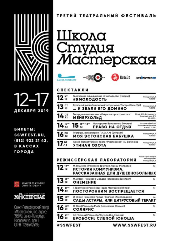 «Школа. Студия. Мастерская» – это фестиваль, на котором традиционно собираются театры, выросшие из актёрских курсов, и театры, в которых сохраняется принцип студийности. Единомышленники, прошедшие одну школу, живущие по принципу мастерской, третий год подряд встречаются в декабрьском Петербурге.