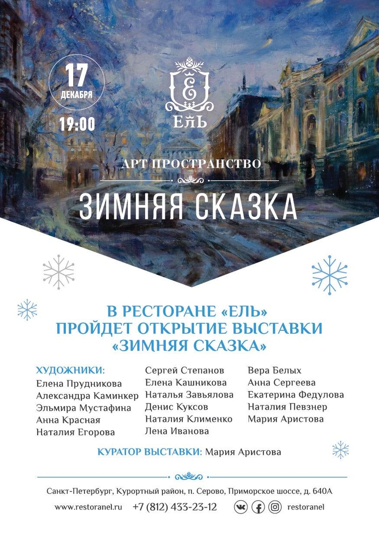 Приглашаем насладиться творческой предновогодней атмосферой на открытии выставки «Зимняя сказка» в арт-пространстве ресторана Ель, Приморское шоссе 640, посёлок Серово.