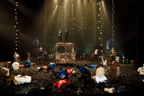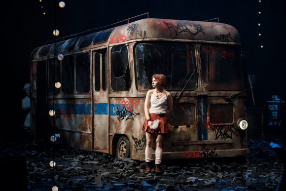 А посреди сцены — настоящий ретроавтобус! Именно в нём происходит таинство первой брачной ночи возлюбленных, в нём они мечтают, сидя у руля и стремясь в будущее, к свободе без всяких условностей, это же и обитель духовника Лоренцо. Но также это ограниченное пространство послужит и местом кровавой бойни Тибальта (Фёдор Федотов) и Меркуцио (Олег Сенченко), и разнузданной вечеринки. Современная молодёжь падка на эпатаж, фрик-шоу и совершенно невообразимые и несовместимые сочетания – а потому огромные бюсты и обломки античных статуй соседствуют с эстетикой стритстайла, бочками-канистрами с граффити и пластами то ли грязи, то ли пепла.