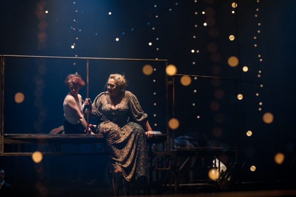 Сценограф Семён Пастух использует пространство по максимуму – персонажи возникают из темноты зала, сидят на бордюре сцены, забираются на верхние ярусы скамей, наблюдая за происходящим вокруг..и чувствуют себя безмерно одинокими.