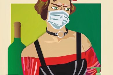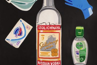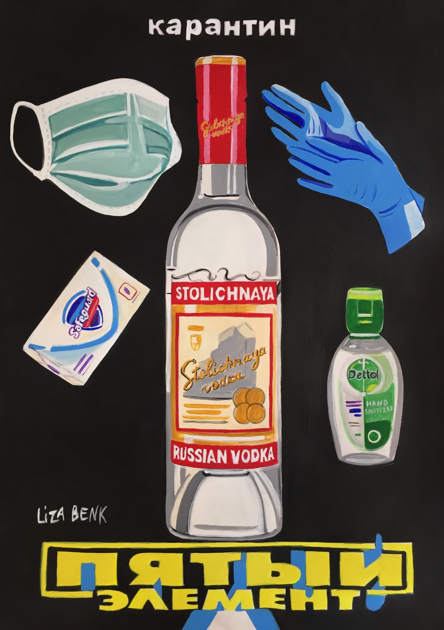 «Пятый элемент»- плакат, выполненный мной в духе оригинального постера к одноименному фильму. Я изобразила пять основных элементов карантина: маска, санитайзер, антибактериальное мыло и перчатки. Но, конечно же, всем нам известно, что русский человек больше верит в силу дезинфекции внутренней, чем внешней. Поэтому водка — необходимый пятый, ключевой элемент для спасения от любой заразы, в том числе и от нового вируса.