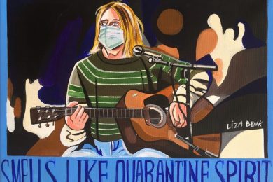 В своем творчестве я стараюсь быть актуальной и быстро реагировать на происходящее вокруг. Картина «smells like quarantine spirit» родилась первой. Во-первых, конечно благодаря созвучности с известнейшей песней Курта Кобейна «smells like teen spirit», а во- вторых, благодаря размышлениям на тему: куда же уходит этот бесстрашный «teen spirit» под натиском пандемии?
