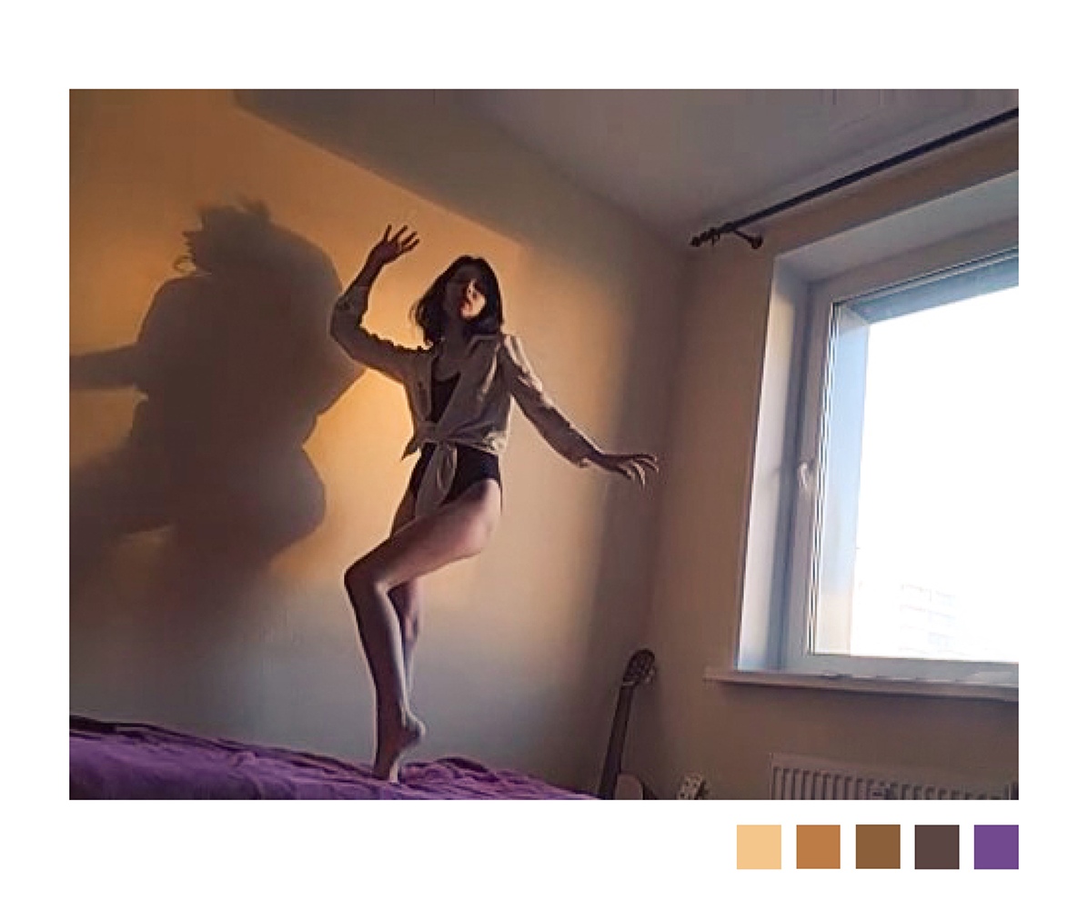 Далее мы обсуждаем концепт, подбираем вещи онлайн из ее гардероба и реализуем съёмку. Фотограф выстраивает позу, регулируя наклон головы, жесты, объясняет, где ловить свет – словом, всё как на обычной съёмке, но дистанционно (в этом вся сложность). Затем, когда кадр выстроен, он нажимает на кнопку, делая скриншот. По словам фотографа Алексея Липчука, в процессе съёмки он вдохновлялся фильмом «Джокер» и саундтреком, весьма резонирующим с нынешней ситуацией — Learning How to Act Normal. Серия снимков получила название Сolours.