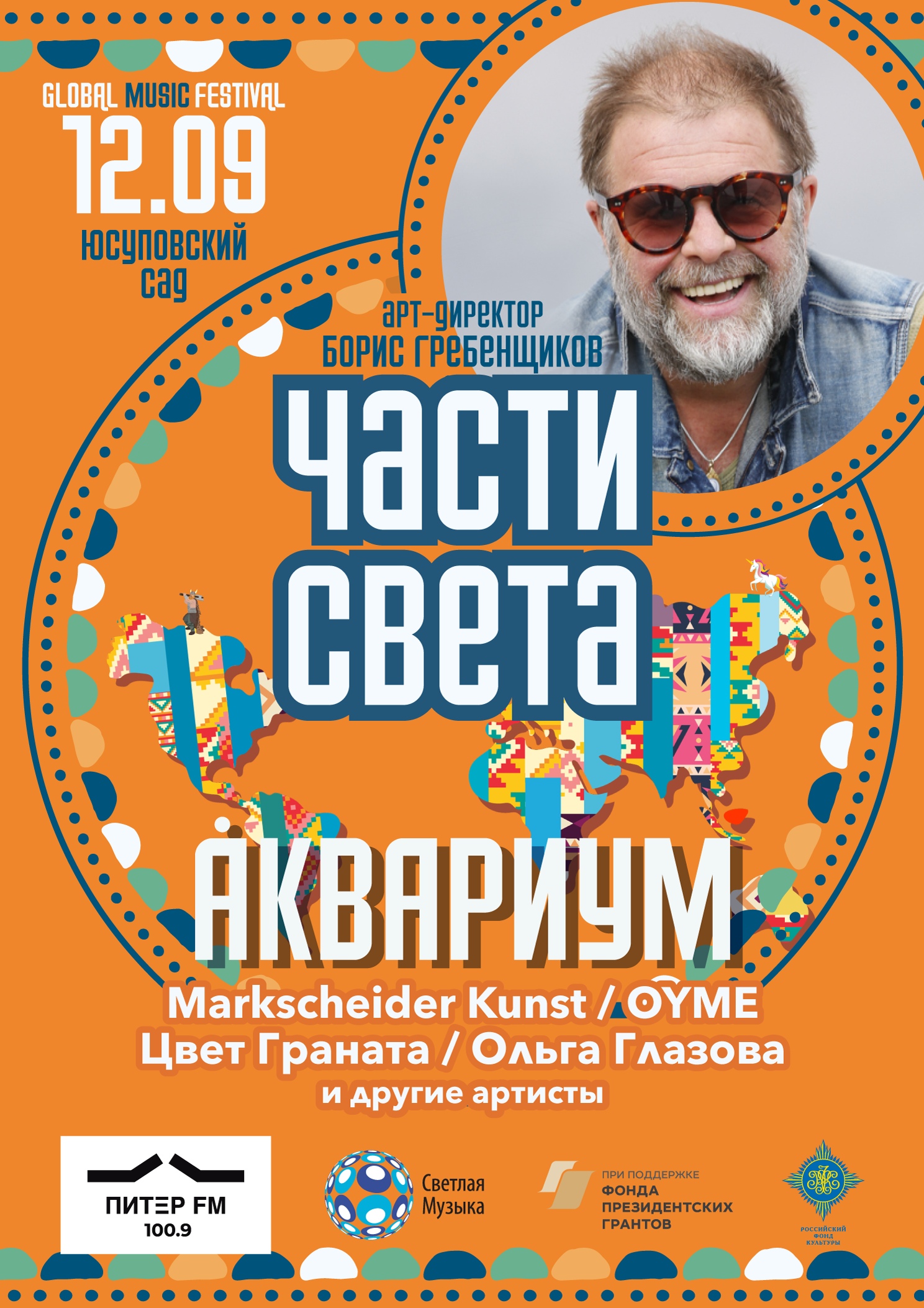 Четвертый фестиваль всемирной музыки «ЧАСТИ СВЕТА» пройдет в Юсуповском саду 12 сентября 2020 года. В четвертый раз в разгар бабьего лета на сцене соберутся музыканты, выбранные Борисом Гребенщиковым, а завершится вечер концертом группы «Аквариум».