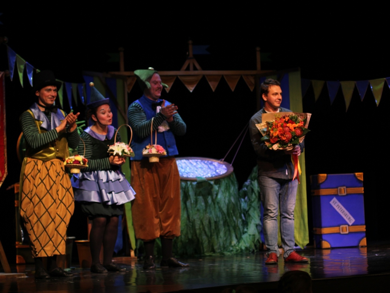 В кукольном театре очень многое зависит от профессионализма артистов. На сцене, среди разноцветных флажков и полосок, расположены несколько чемоданов-книг, и из них артисты театра Екатерина Стукалова, Антон Витченко, Артем Преображенский, Тамара Путрик, Яна Сарафанникова и Ольга Маноцкова достают кукол, словно кукольники из фургона в былые времена. Наряды актеров, включая шляпы, полосатые кофты и клетчатые штаны, выполнены в стилистике комедии дель арте, по жанру которой Коломбина и Арлекин развлекают зрителей в честь праздника на главной площади города.