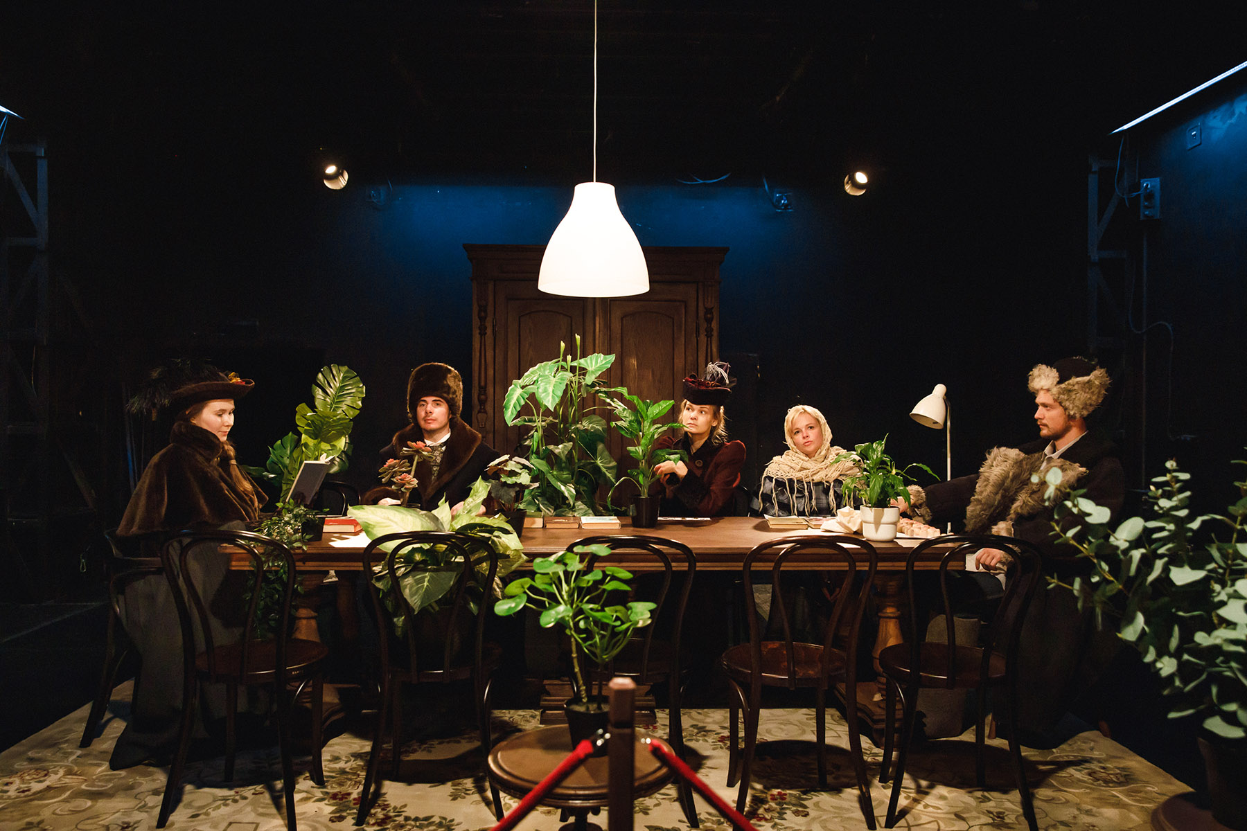 Пространство сцены напоминает музей, застывшую картину из романа Тургенева или Толстого (по словам Волкострелова, эта идея родилась у него после поездки в Ясную Поляну). Появившиеся актёры будто туристы на экскурсии внимательно изучают законсервированные предметы, делают селфи,с любопытством вглядываясь в экспонаты — гусиные перья, старинный буфет, шахматы.